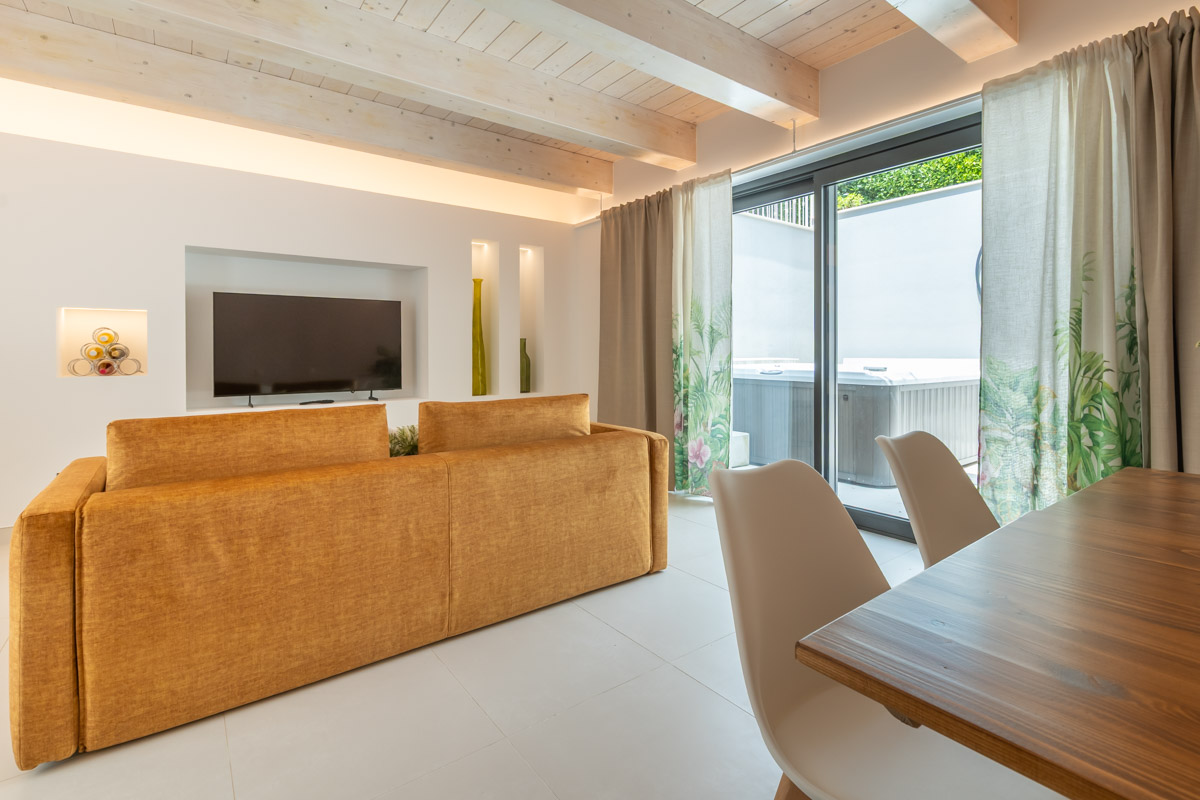 Moderna sala comune con un comodo divano, TV 55", tavolini e naturalmente vasca idromassaggio